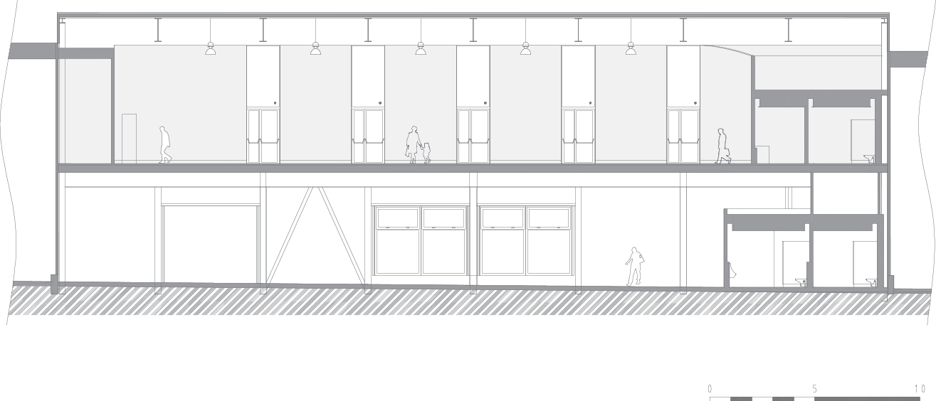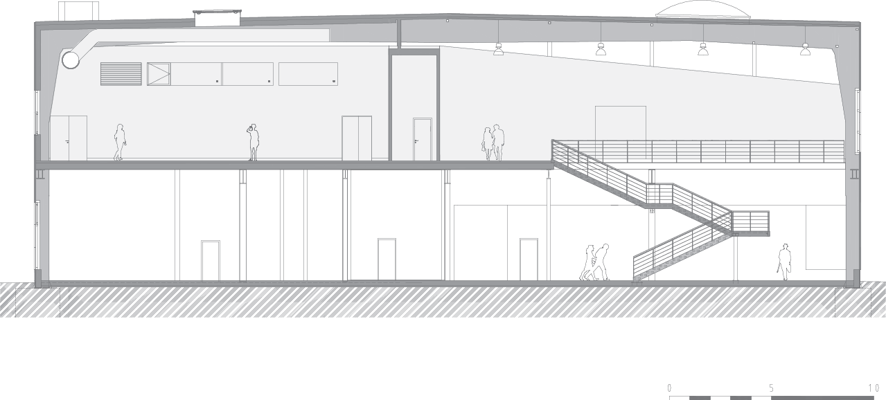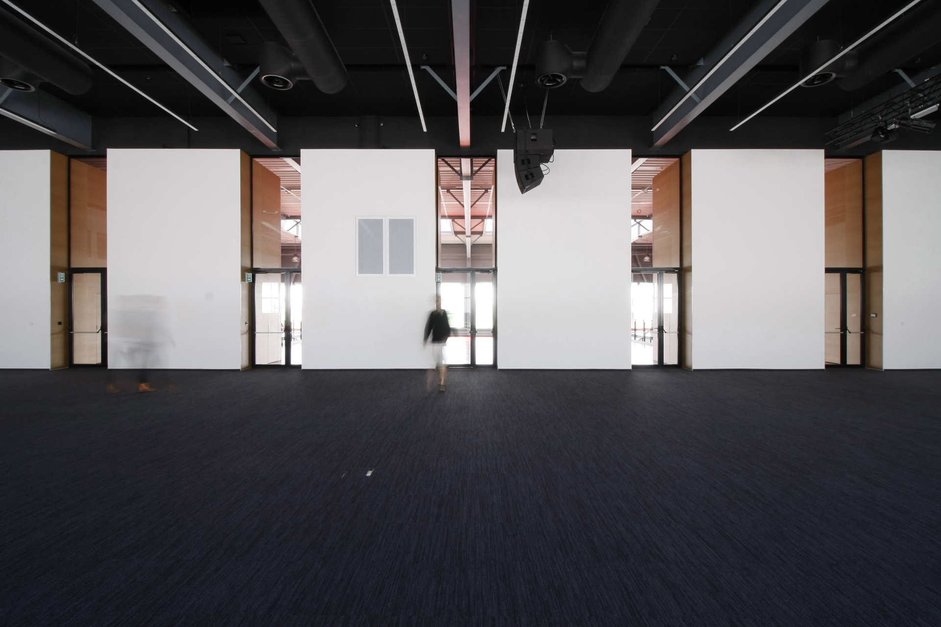 Propojení je realizováno pomocí pěti lapidárních zářezů v rytmu stávající konstrukce haly. Zjednodušují orientaci, průstupnost a přes velkoformátové prosklení nechávají přehlédnout nerušeně celý prostor.