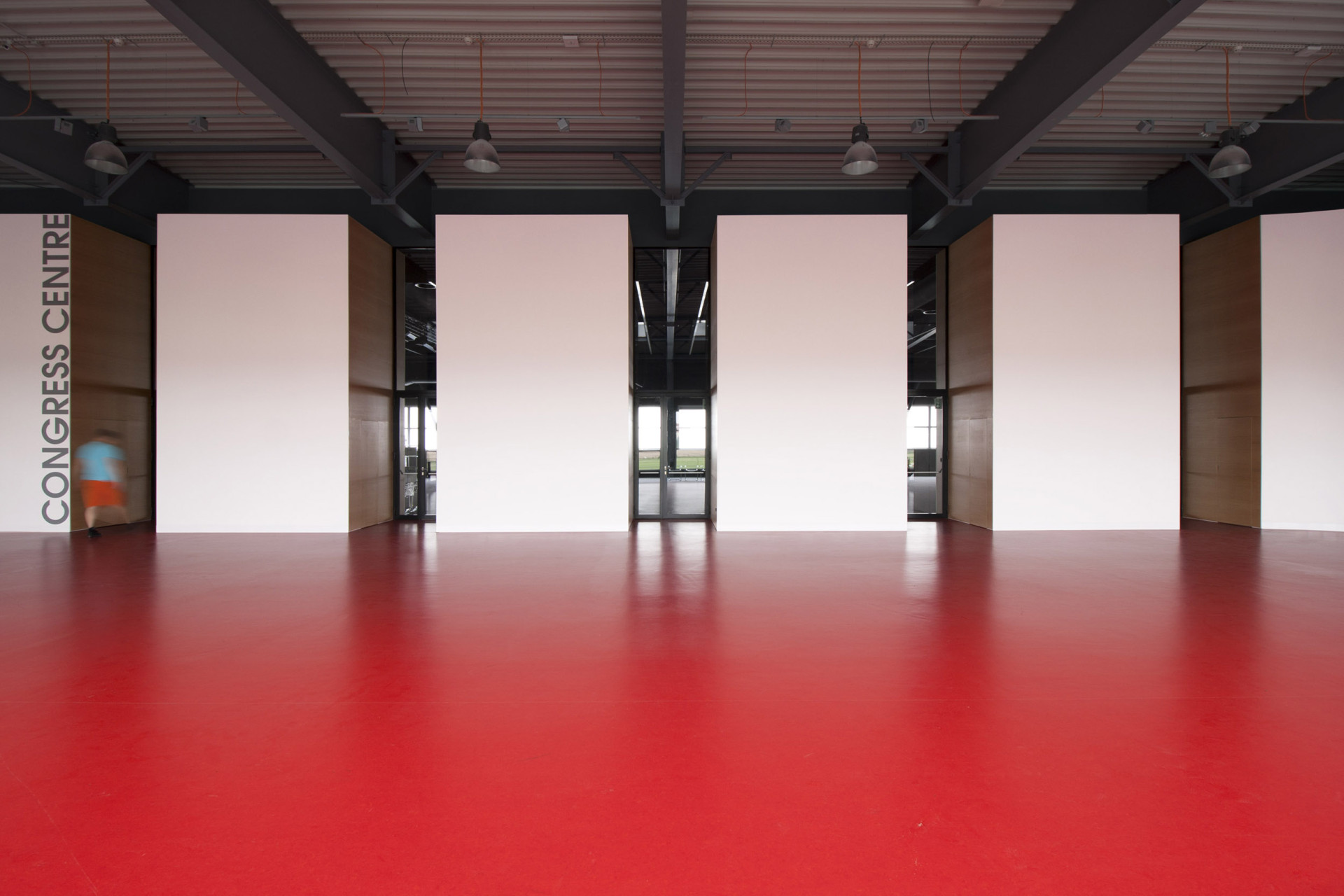 První je otevřený, rušný, plný života a pohybu. Červená podlaha v kontrastu s bílým lesklým pláštěm a průmyslovými ocelovými nosníky tvoří výrazný a na první pohled snadno zapamatovatelný obraz.