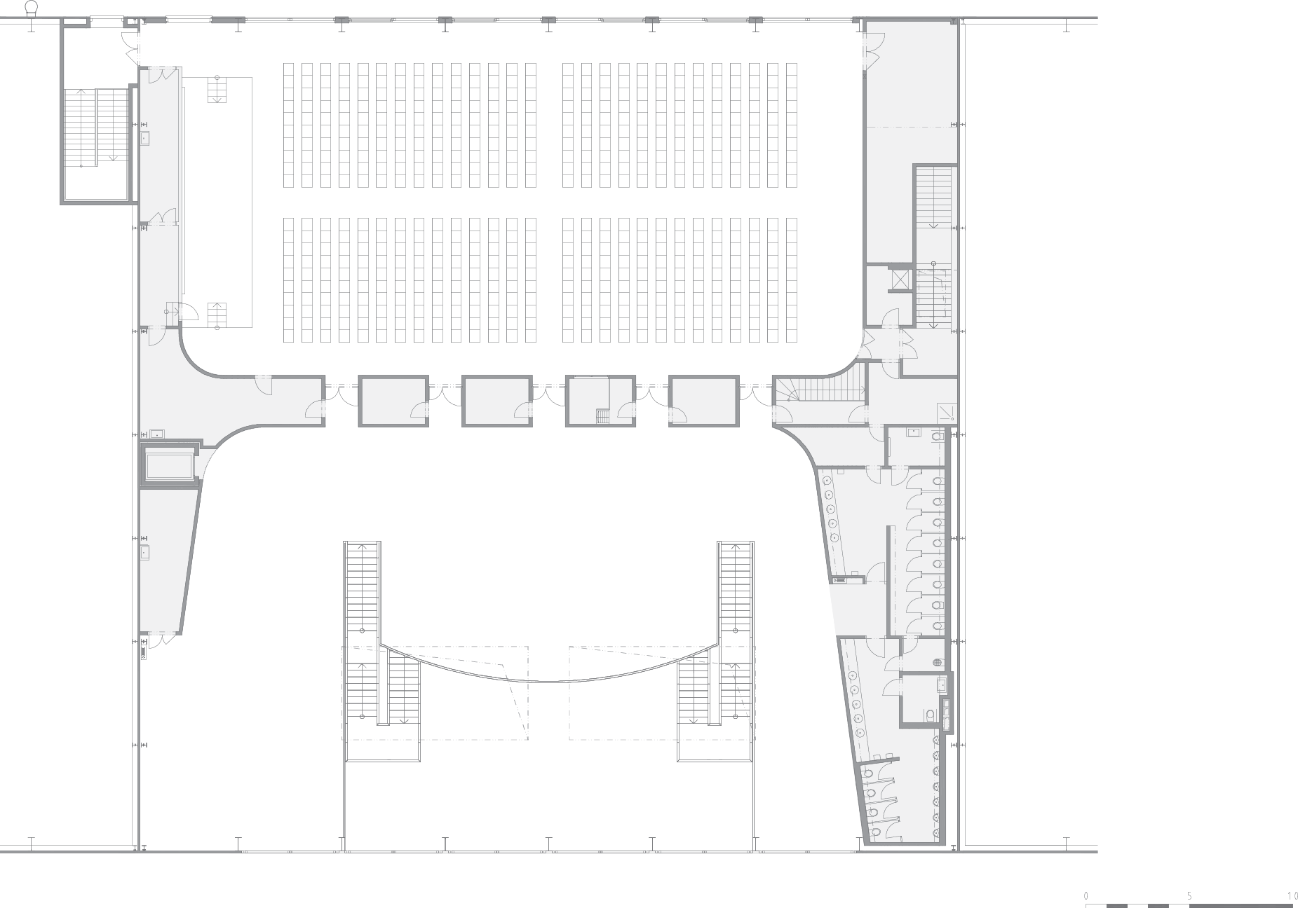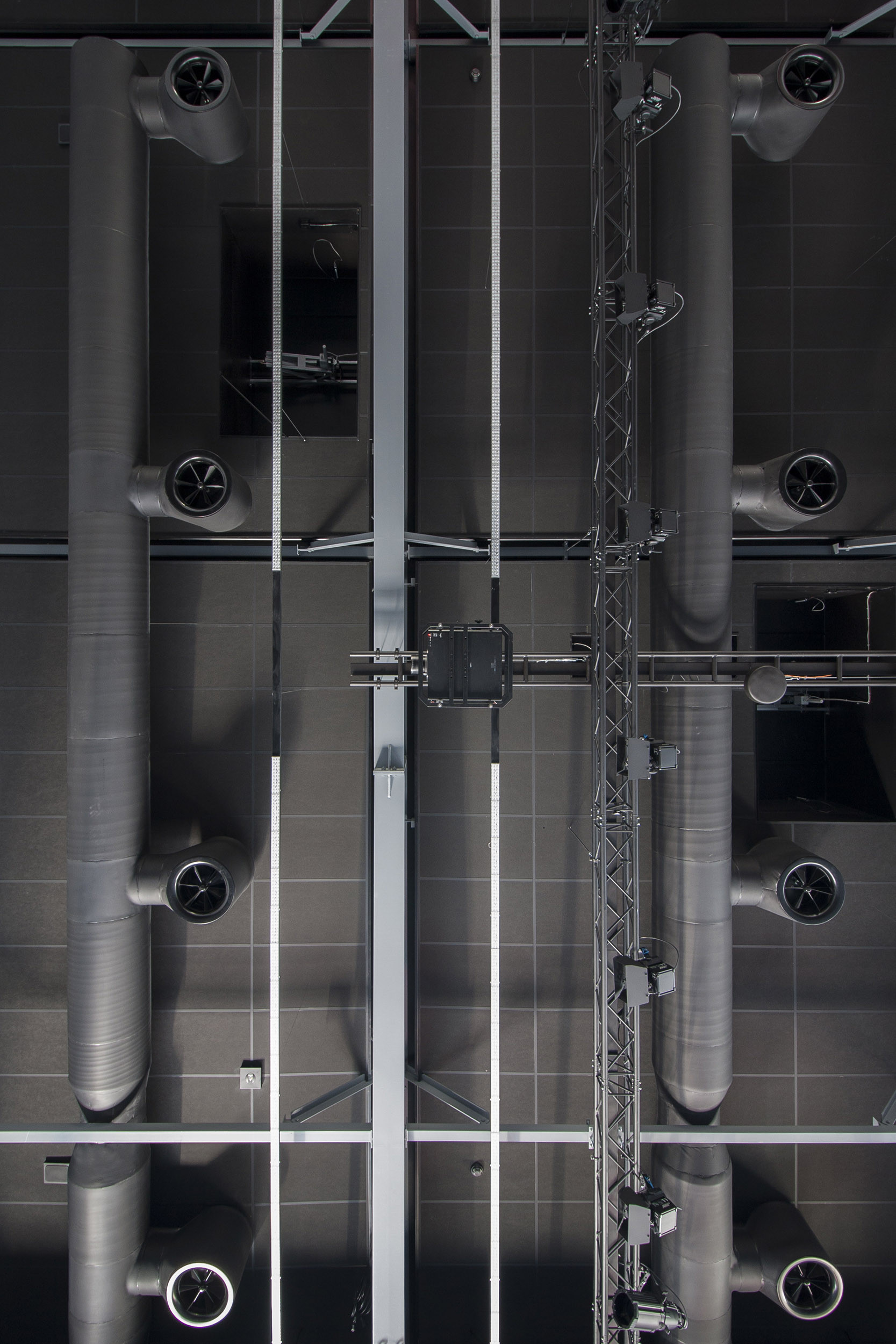 Prostor sálu je naopak záměrně tlumenější a nechává tak vyniknout tomu co se v něm děje. Příjemný dojem podporuje kvalitní akustické řešení, stmívatelná svítidla, měkký koberec a jednoduchá černo-bíla barevnost.
