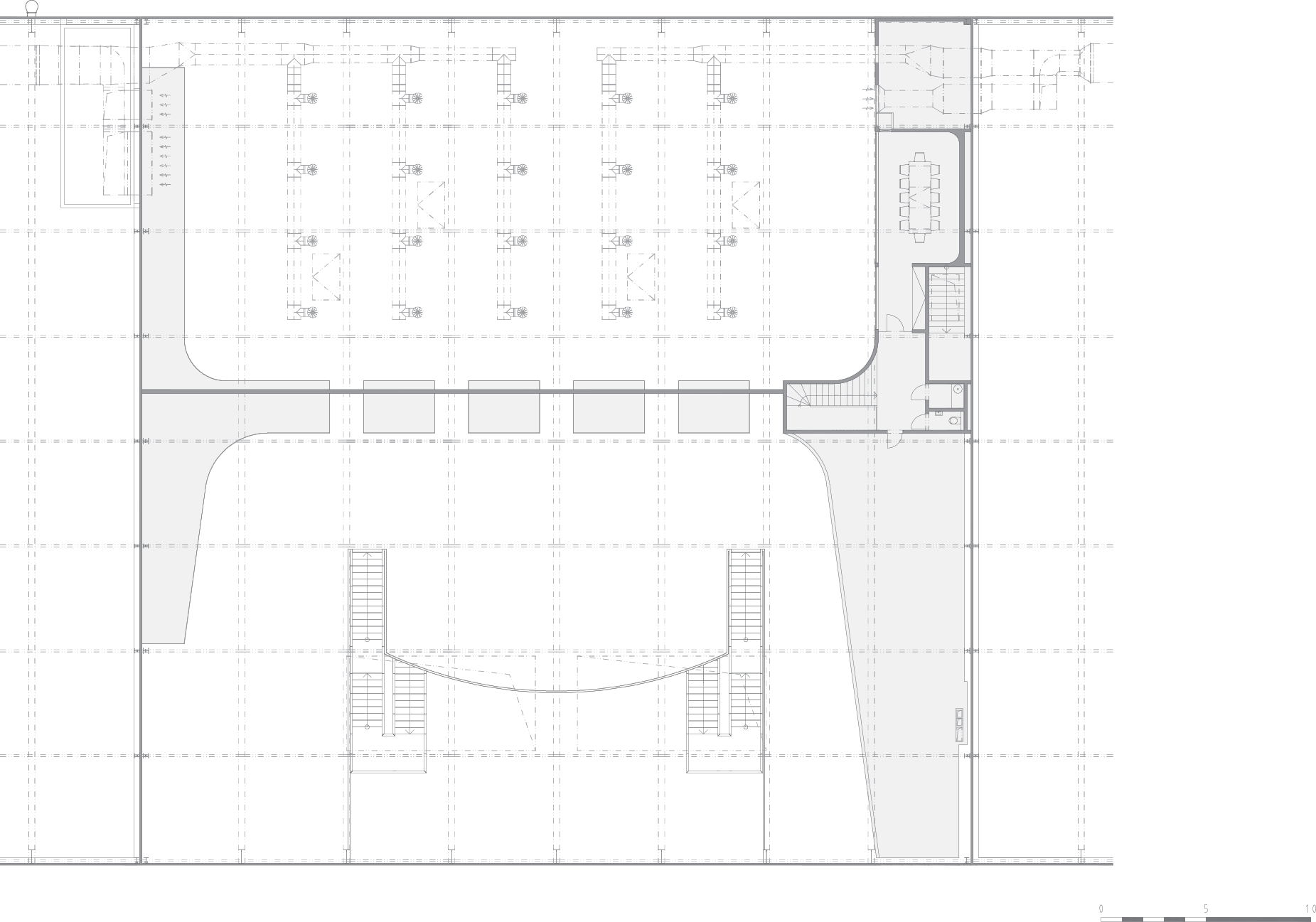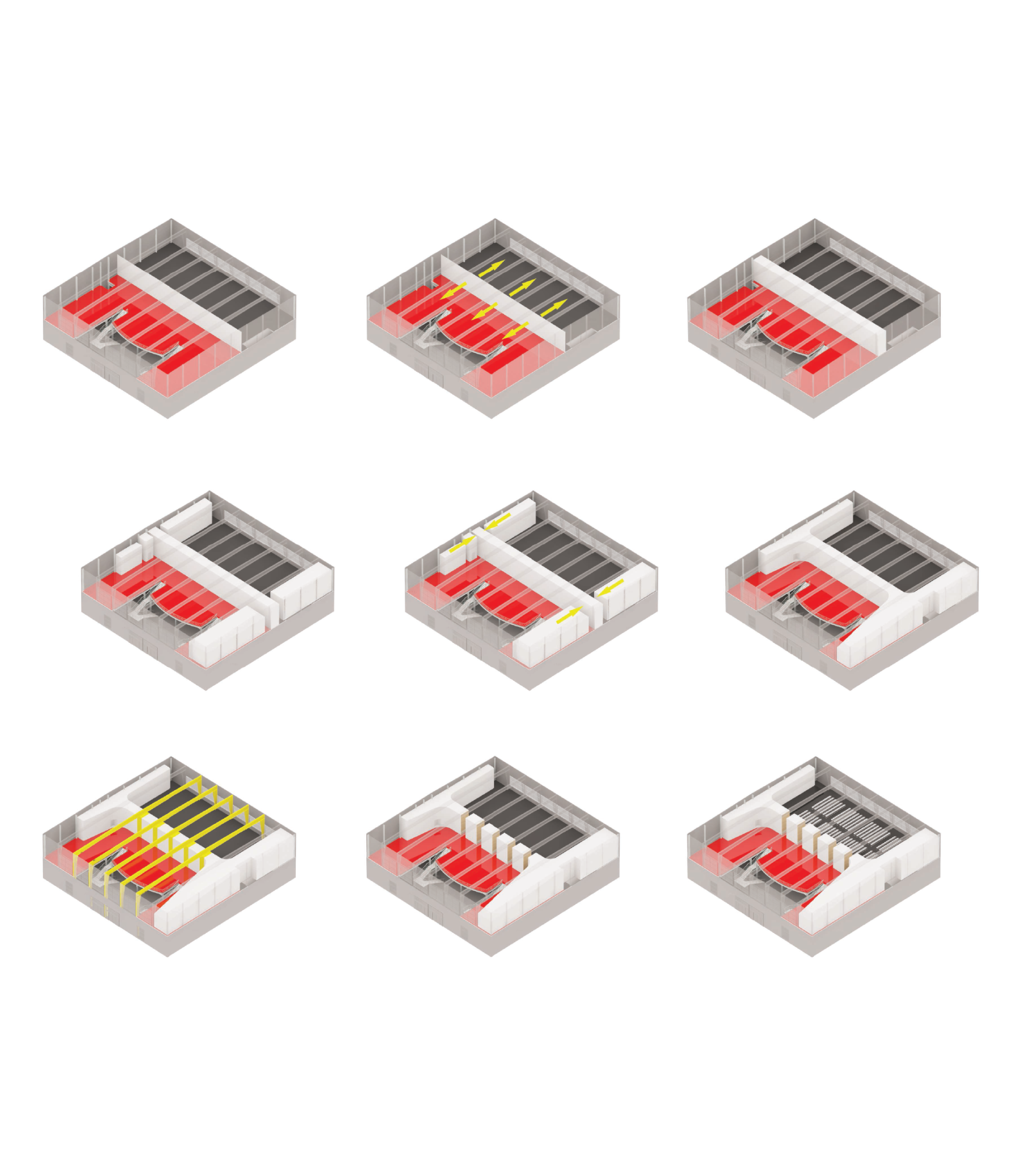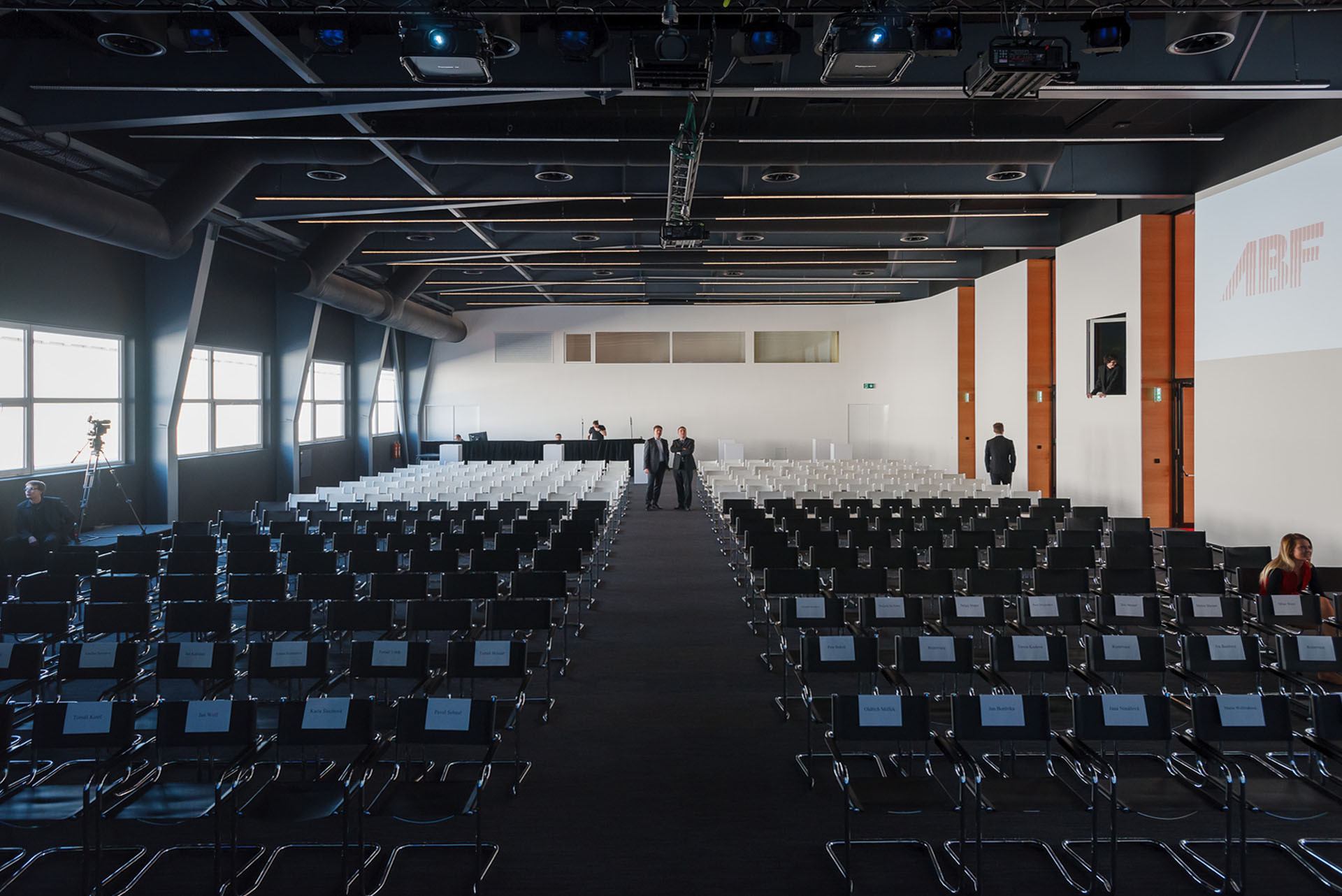 Na základě řady studií a variant jsme definovali jasně čitelný koncept, který se ve třech fázích zrealizoval. Jednoduchým vložením nezávislé a výrazově odlišné struktury do existující průmyslové haly redefinujeme její vnitřní prostor. Vznikají tak dva propojené a přesto velice odlišné světy – velkorysý foyer s otevřenou galerií a multifunkční kongresový sál.