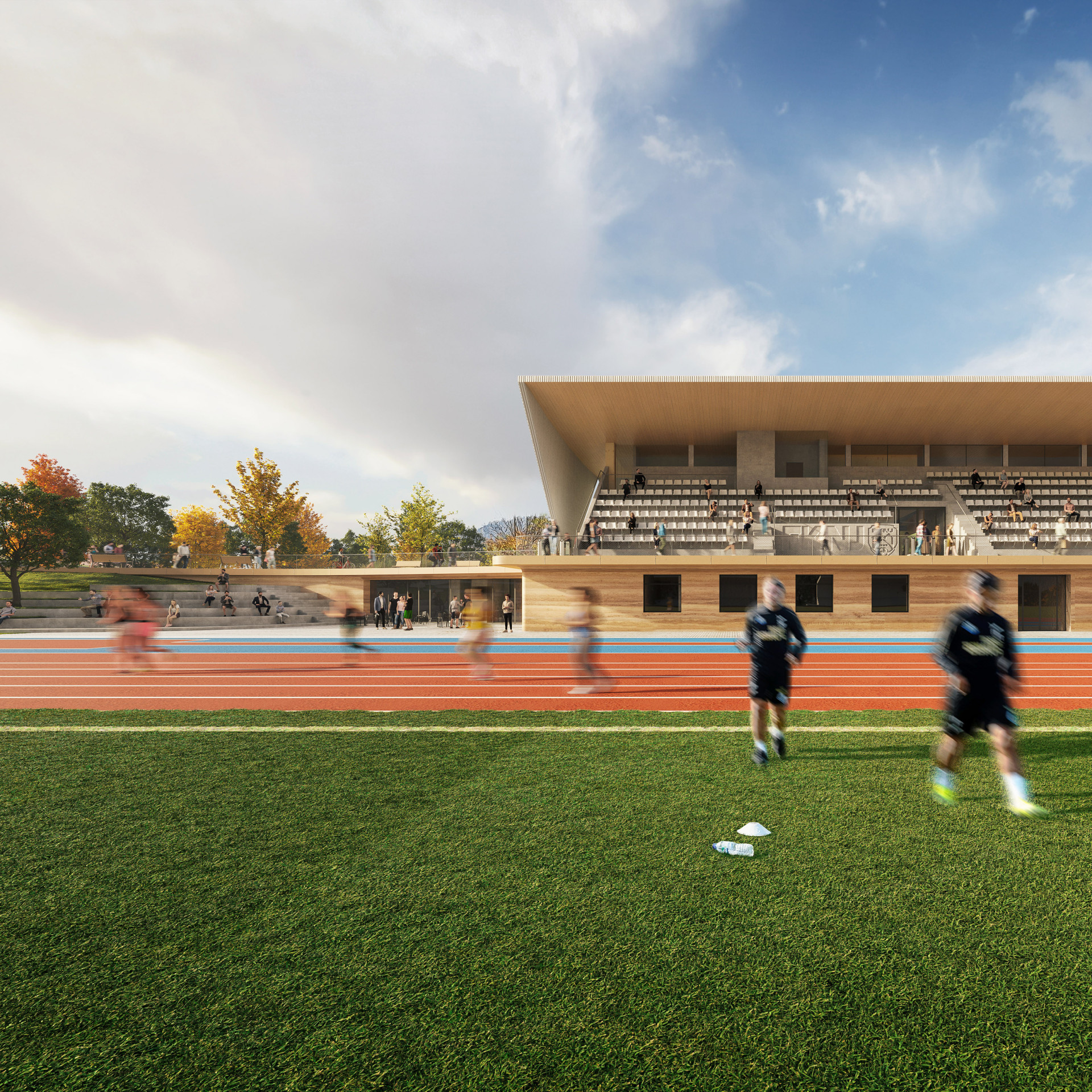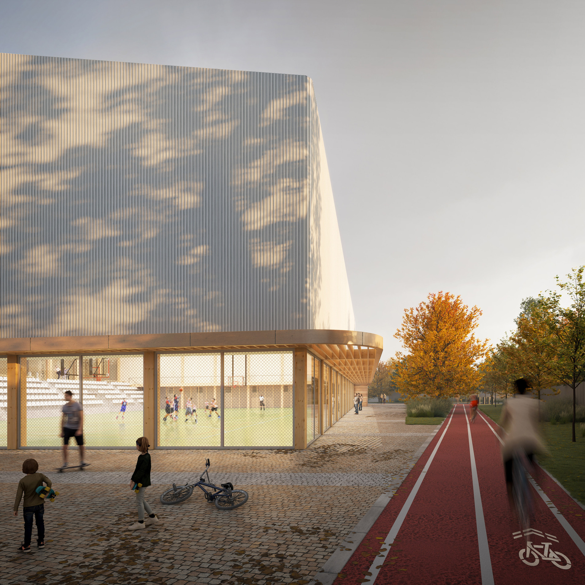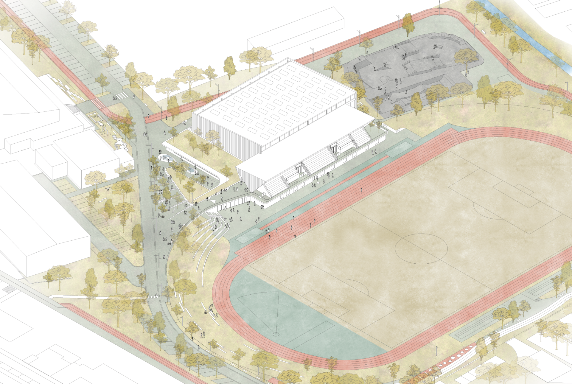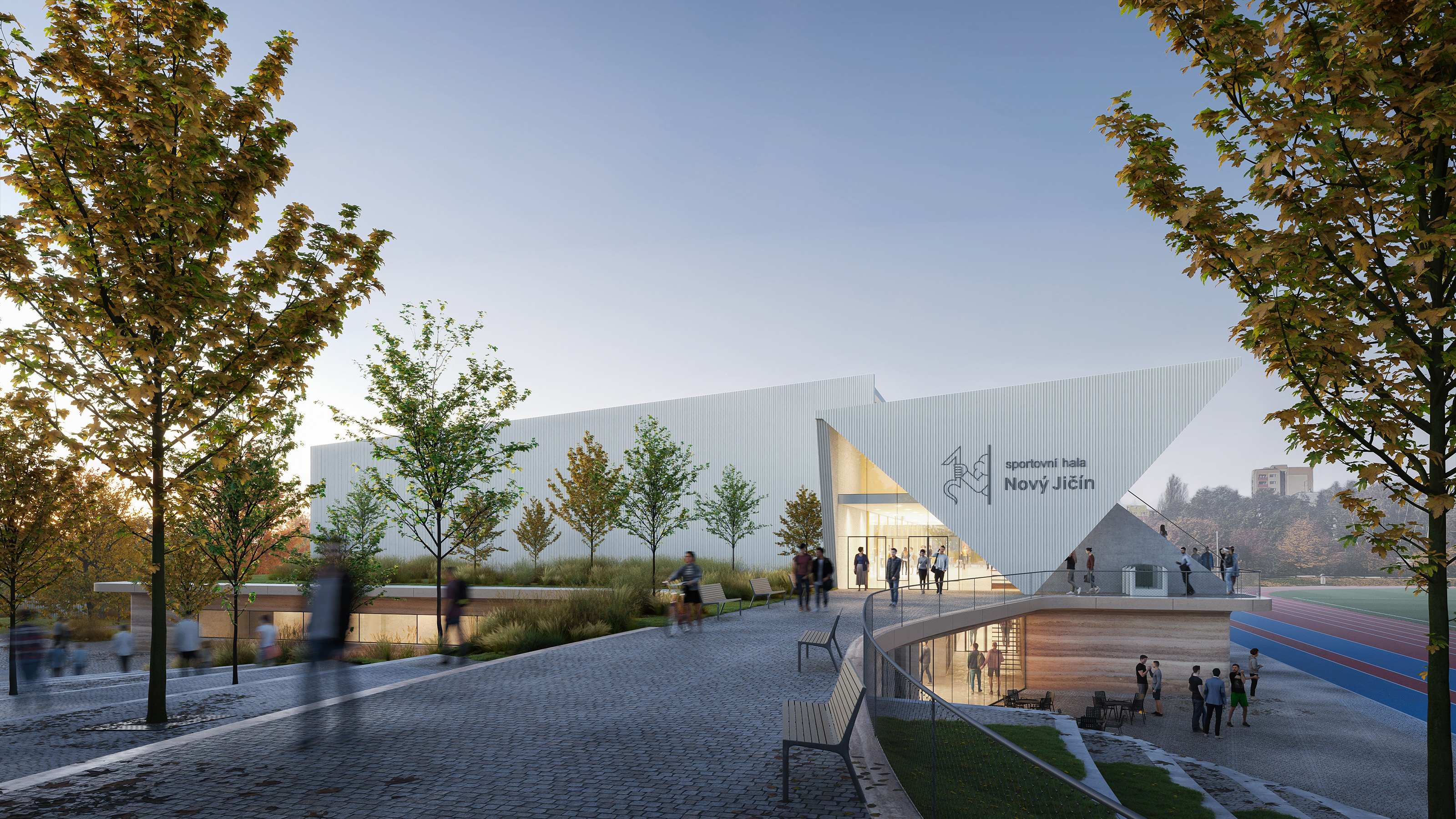 Díky sofistikovanému napojení na okolí zajišťuje zcela bezbariérový a bezkolizní provoz sportovců i diváků.