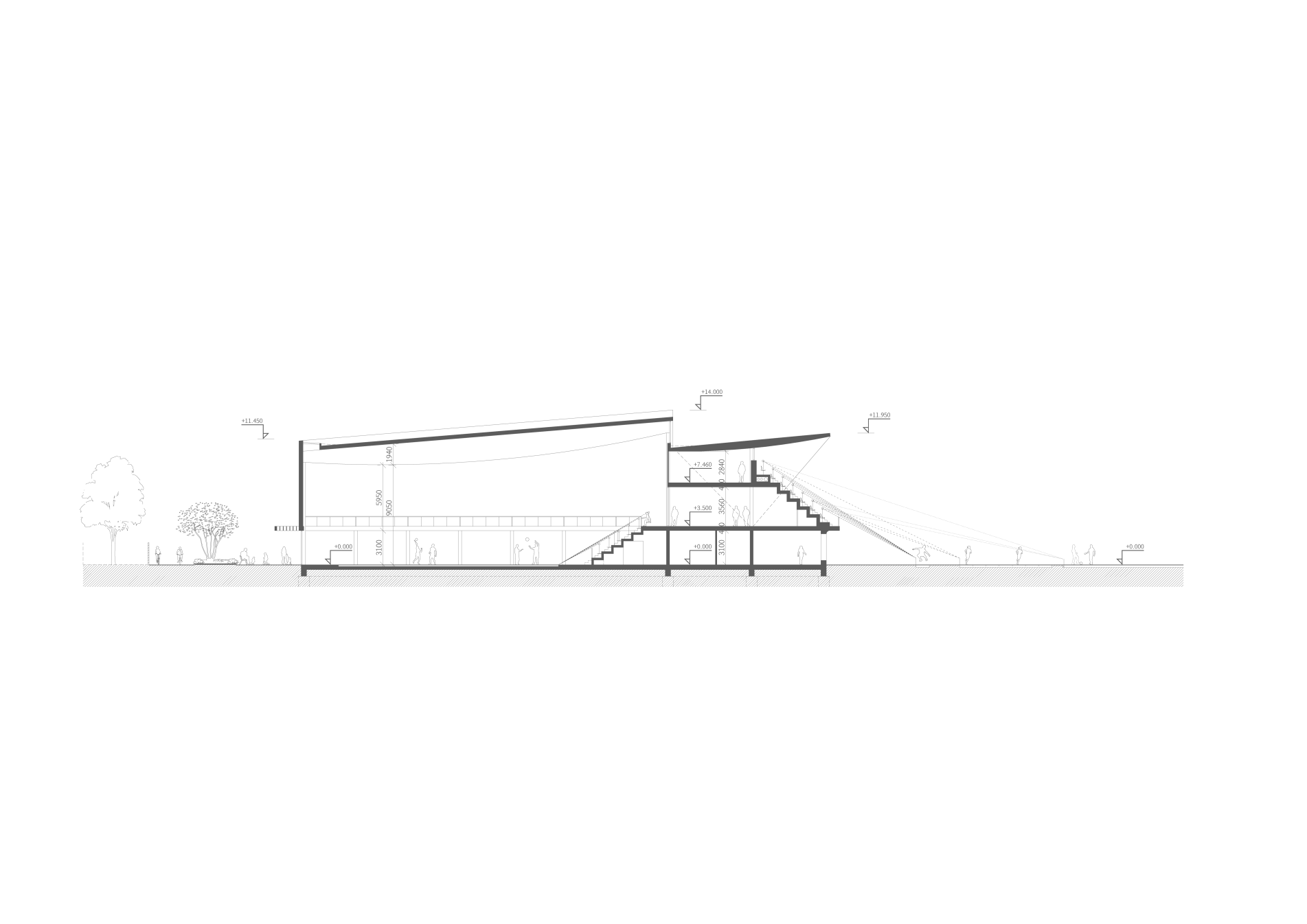 Velký obestavěný prostor získává hmotovým a materiálovým členěním lidské měřítko.