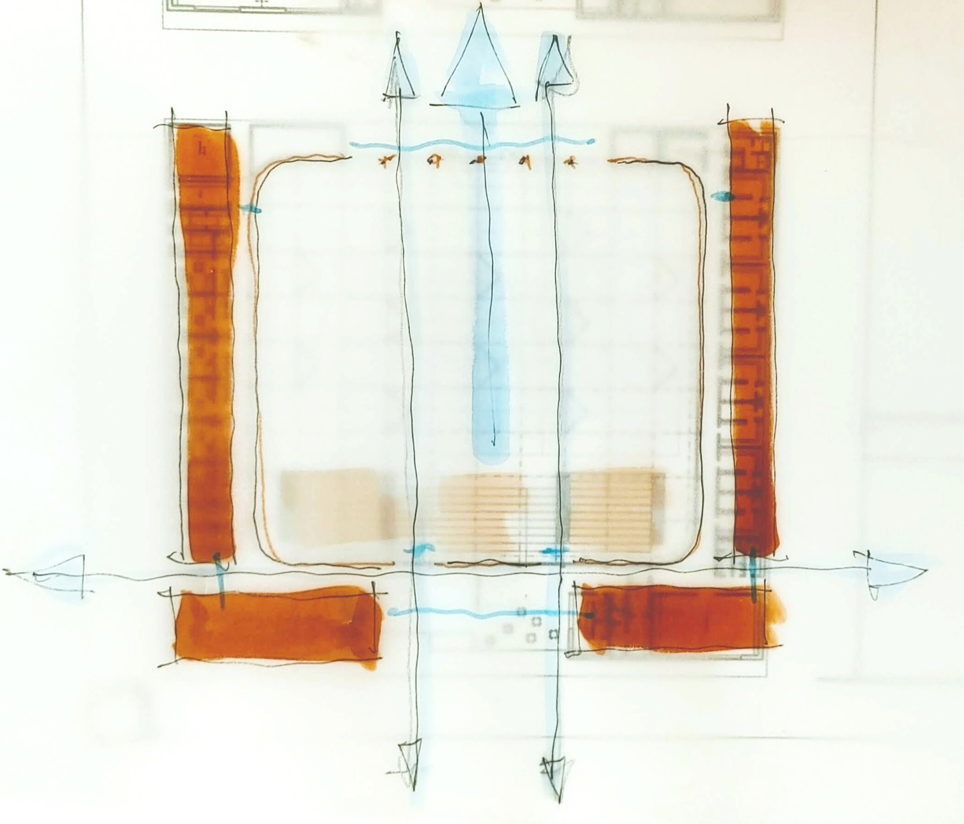 Princip dělení do samostatných hmot jsme našli v průsečíku různých požadavků jednotlivých provozů, jejich nezávislém fungování, napojení na okolí a potřebou vnitřních komunikací. V objektu nejsou chodby chápané v klasickém smyslu, jedná se o prostory mezi pláštěm haly a jednotlivými krabičkami. Pokračování veřejného prostoru parteru v interieru budovy za skleněnou membránou. Každá část dostane svobodně co potřebuje - správnou polohu, velikost, napojení na okolí, nasvětlení, otevřenost či soukromí.