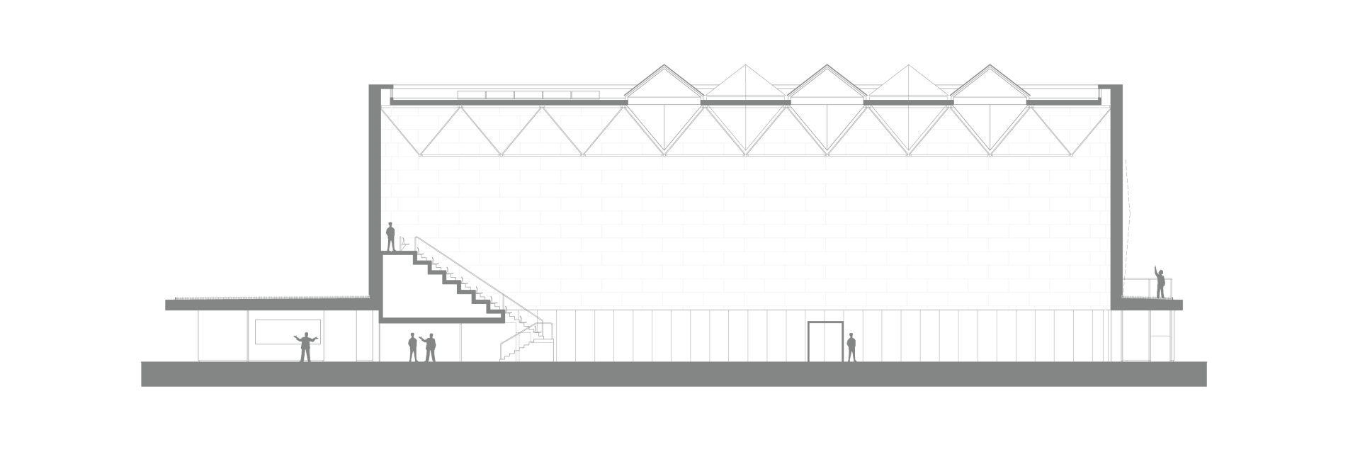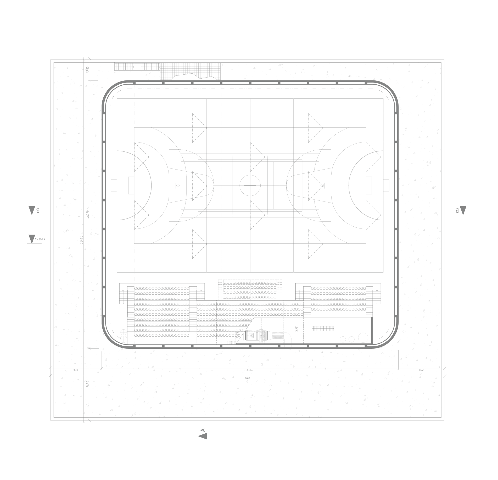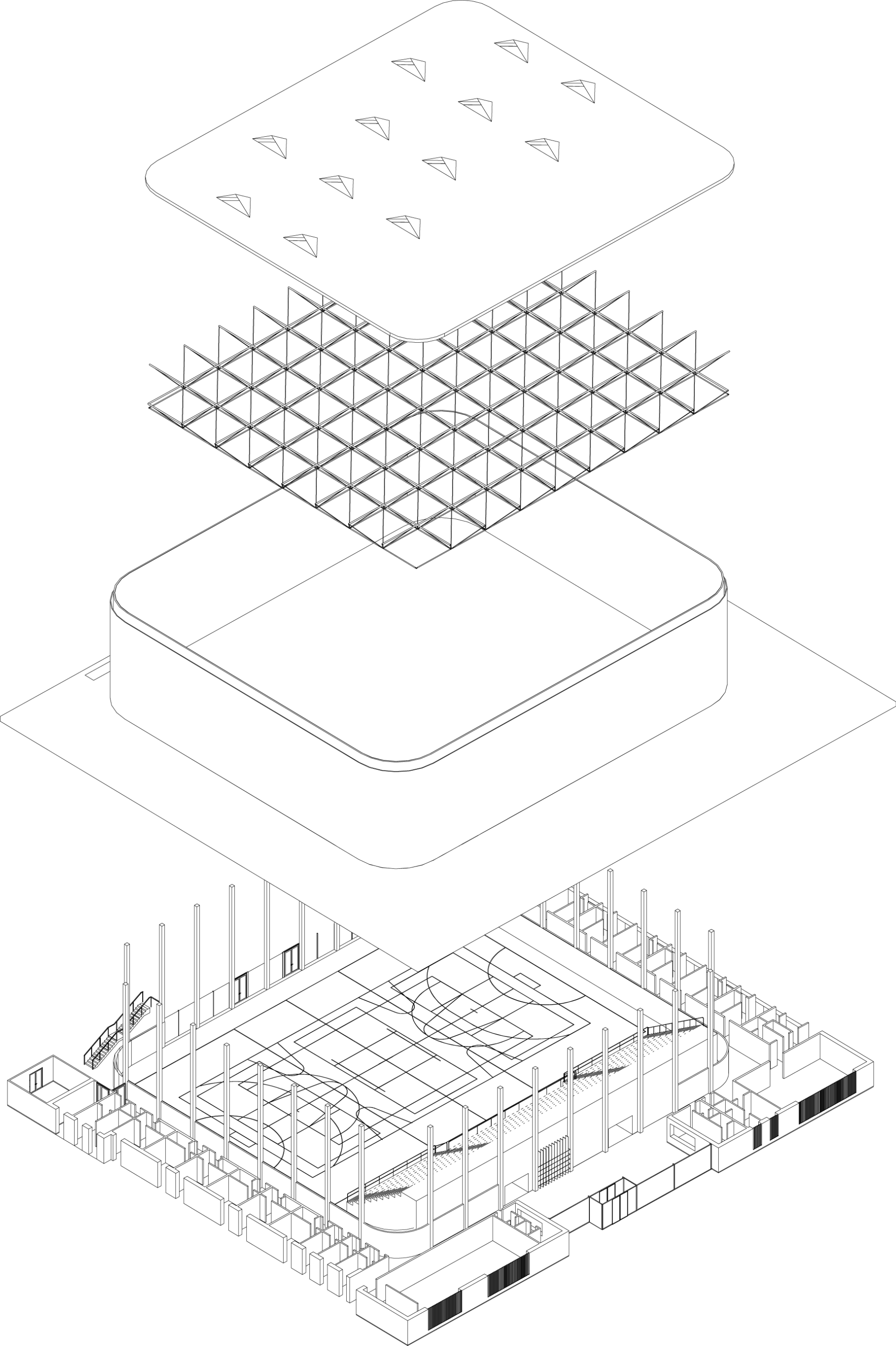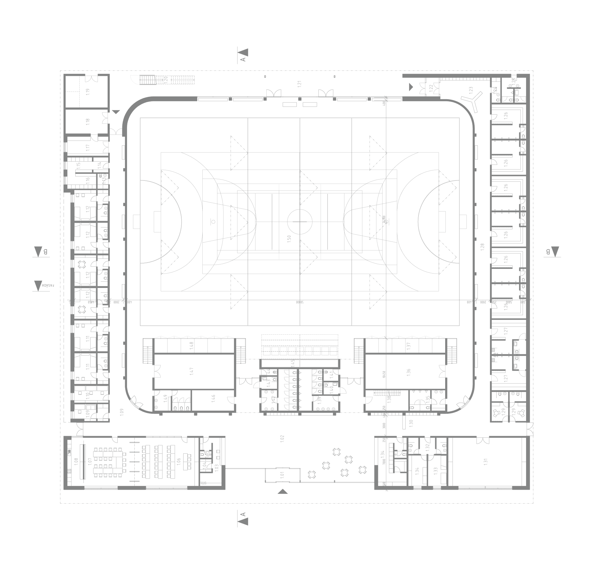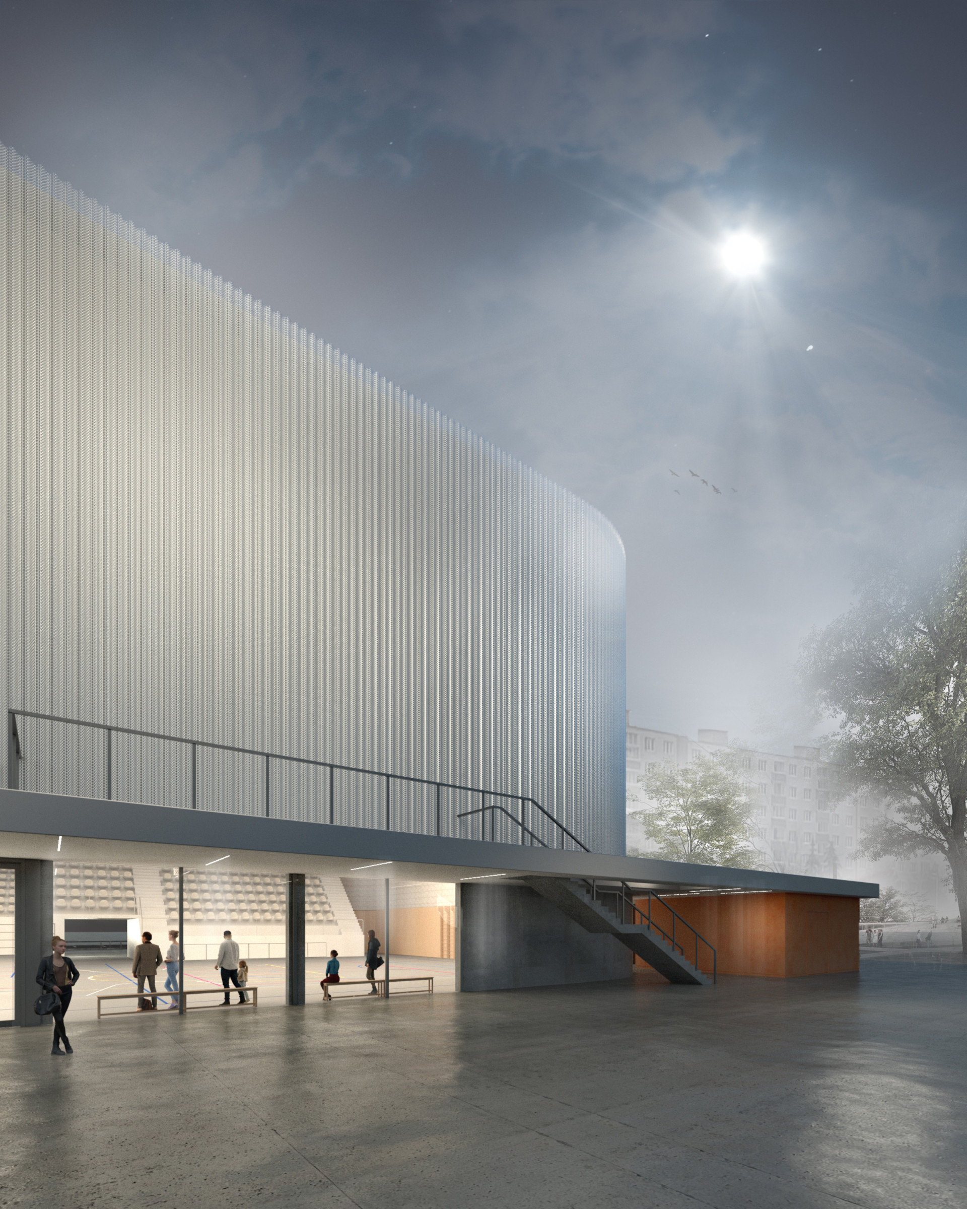 Svou polohou člení stavba plochu na veřejné či poloveřejné subprostory s různým využitím a charakterem. Ke každému z nich se přimyká v rovině parteru jiným způsobem. Každá ze čtyř stran objektu je v našem pojetí důležitá, má svoje specifika a vazby. Hlavní hmota haly je naopak sjednocujícím prvkem a ve výrazu jednotná ze všech stran.