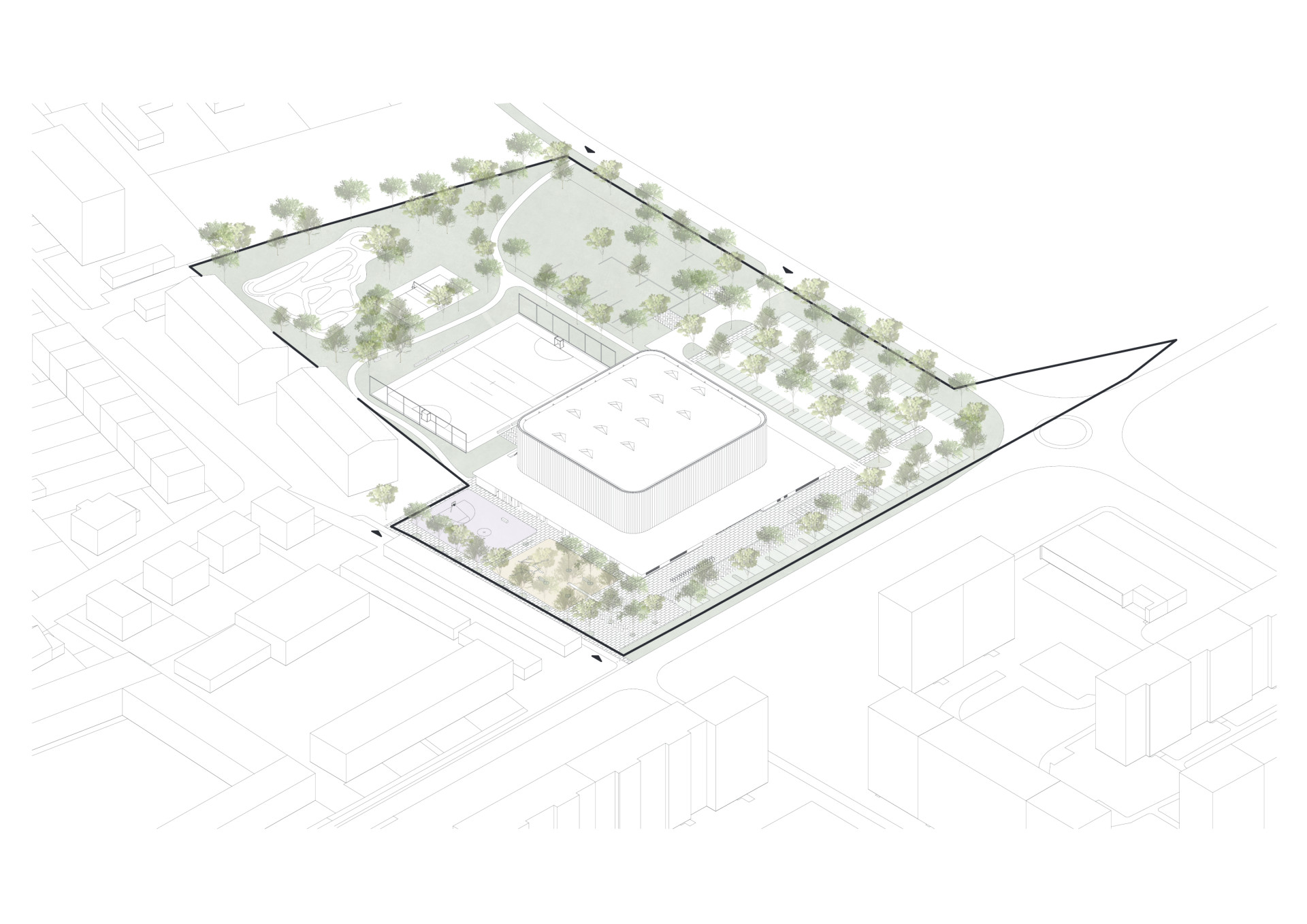 Severní předpolí u pěší trasy a hrany objektu garáží tvoří veřejný prostor - městský park s geometrickou strukturou stromů, zpevněnou plochou, lavičkami, mlatovou části s herními prvky pro děti a malým hřištěm pro minifotbálek či házení na koš. Prostor napojuje halu ve směru z města, nasává kolemjdoucí a působí jako nenápadný komunikační kloub. Obrací se sem ubytovací část přes mezistupeň pavlače za nerezovou popnutou zelení.